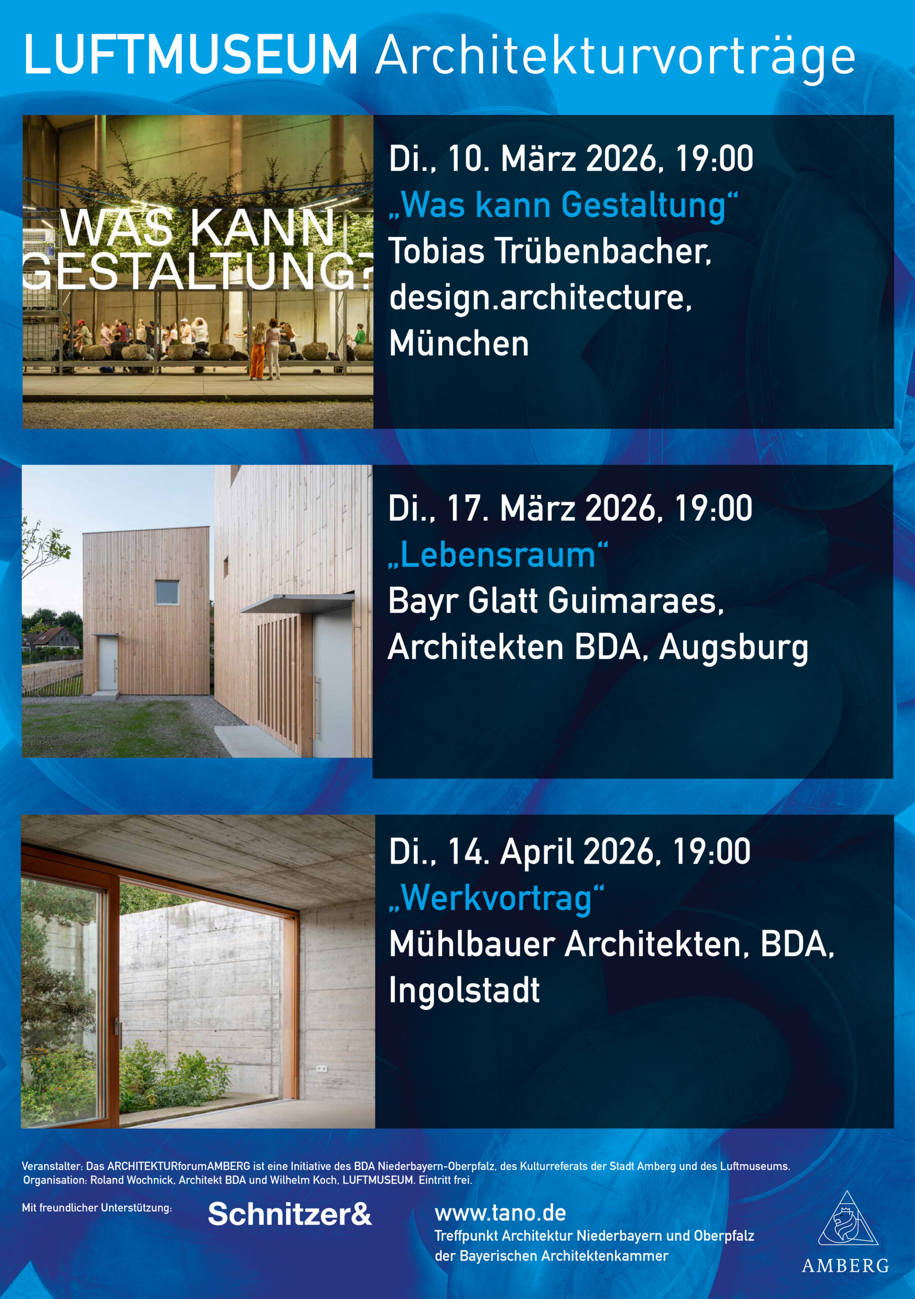 Das ARCHITEKTURforumAMBERG ist eine Initiative des BDA Niederbayern-Oberpfalz und des Luftmuseums. Um das Interesse der Öffentlichkeit für Planungs- und Baukultur zu wecken, möchte das ARCHITEKTURforumAMBERG durch verschiedene Veranstaltungen informieren und zur Meinungsbildung und Diskussion anregen. Organisation: Roland Wochnick, Architekt, und Wilhelm Koch, LUFTMUSEUM.