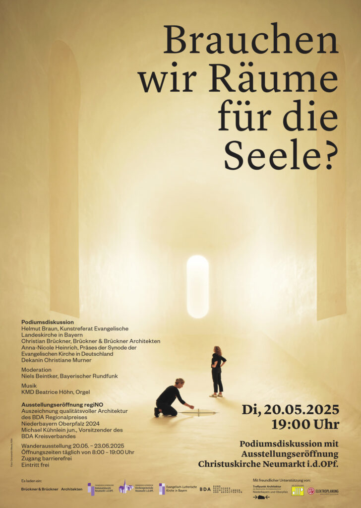 Anlässlich dieser Auszeichnung präsentiert der BDA Niederbayern Oberpfalz gemeinsam mit Brückner & Brückner Architekten, der Evangelisch-lutherischen Kirche in Bayern, dem Evangelisch- lutherischen Dekanatsbezirk Neumarkt i.d. OPf. sowie der Evangelisch-lutherischen Kirchengemeinde Neumarkt i.d.OPf. in der Christuskirche in Neumarkt vom 20. bis 23. Mai 2025 die Wanderausstellung des regiNO Regionalpreises.